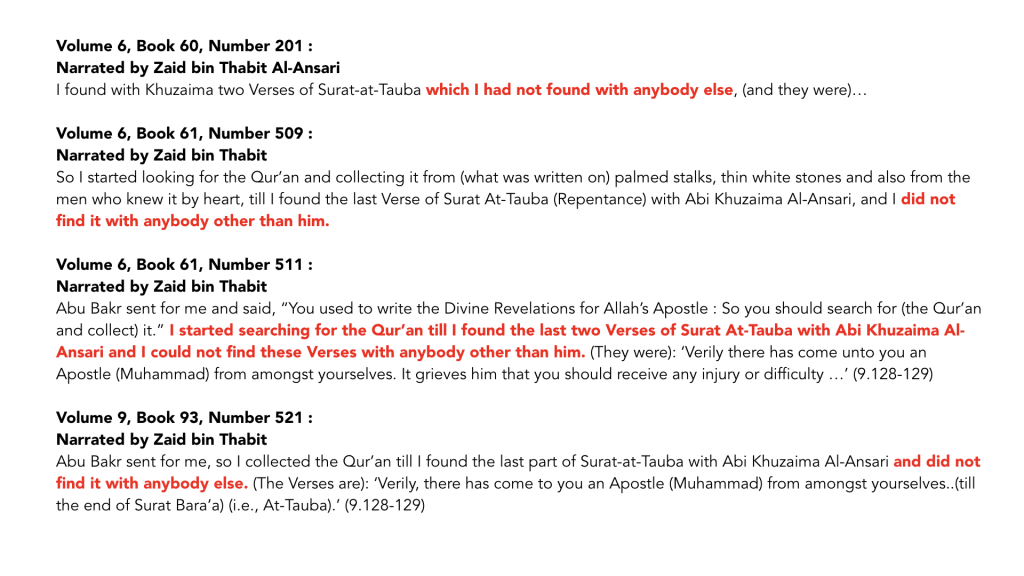 If we are to accept this narrative, that verses 9:128 and 129 were only with Khuzeimah, this means that during the prophet’s life not a single one of his companions could have honestly claimed to have memorized the whole Quran. This includes Abu Bakr (first caliph, d. 634), ‘Umar b. al-Khattab (second caliph, d. 656), ‘Uthman b. ‘Affan (third caliph, d. 656), ‘Ali b. Abi Talib (fourth caliph, d. 660), Abu Musa al-Ash’ari (d. 664), and Zaid b. Thabit (d. 665). Additionally, this means that not a single one of the 65 scribes that the prophet had at his disposal had these two written down anywhere. How is this possible with the supposed thousands of companions who memorized the Quran, that not a single one of them aside from Khuzeimah had these two verses written or memorized?