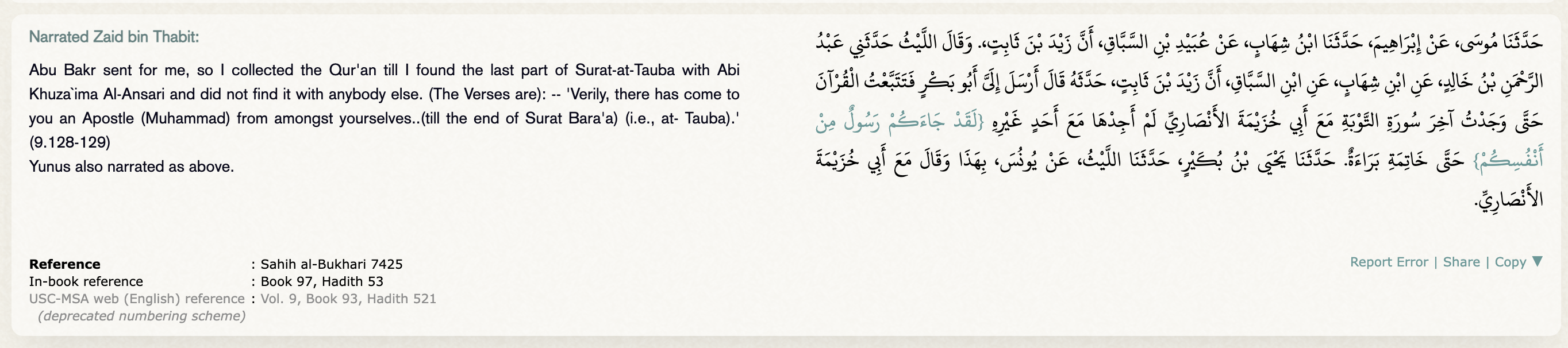 Zaid bin Thabit said: ‘I missed an Ayah of Surat Al-Ahzab that I heard the Messenger of Allah (ﷺ) reciting: Among the believers are men who have been true to their covenant with Allah, of them some have fulfilled their obligations, and some of them are still waiting (33:23) – so I searched for it and found it with Khuzaimah bin Thabit, or Abu Khuzaimah, so I put it in its Surah.'” (Reference: Jami` at-Tirmidhi 3104; In-book reference: Book 47, Hadith 156; English translation: Vol. 5, Book 44, Hadith 3104)