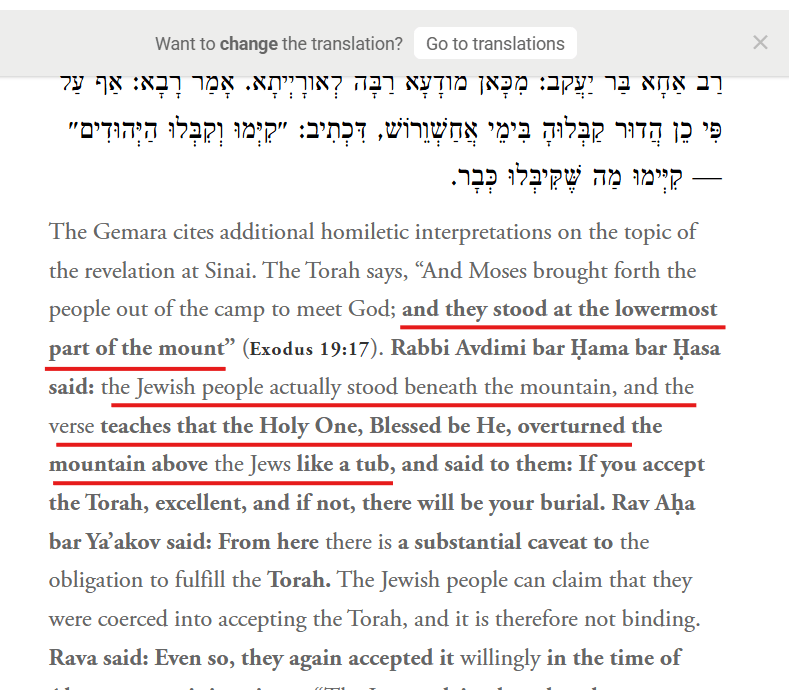 But where can we find this event in the Bible? In Exodus 19:17 we read about a similar event that contextually appears to match the account in the Quran, but according to most translations it seems to indicate that this event took place at the foot of the mountain as opposed to the mountain being lifted above the Children of Israel.