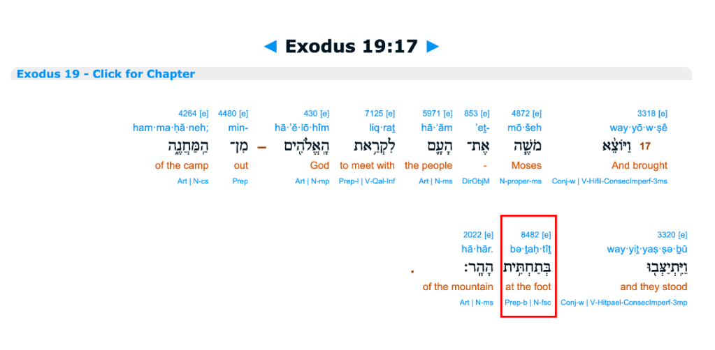 16 On the morning of the third day there was thunder and lightning, with a thick cloud over the mountain, and a very loud trumpet blast. Everyone in the camp trembled. 17 Then Moses led the people out of the camp to meet with God, and they stood at the foot (בְּתַחְתִּ֥ית / bə·ṯaḥ·tîṯ) of the mountain. 18 Mount Sinai was covered with smoke, because the Lord descended on it in fire. The smoke billowed up from it like smoke from a furnace, and the whole mountain trembled violently. 19 As the sound of the trumpet grew louder and louder, Moses spoke and the voice of God answered him.
