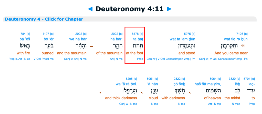 Additionally, Deuteronomy 4:11 provides additional support that the mountain was lifted over the heads of the Children of Israel as depicted in the Quran. When we look at the Hebrew word “at the foot” (of the mountain) in Deuteronomy 4:11 we see that the word that is used is תַּחַת / tachath. This word means: underneath, below, or instead of. This word occurs 504 times in the Bible, and is used to mean underneath or below (see: Genesis 1:7, 6:17, 7:19, 18:4, 18:8, 24:9, 35:4, 35:8…) as well as at the foot of.