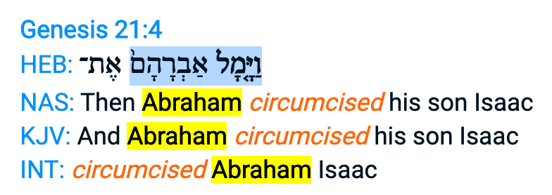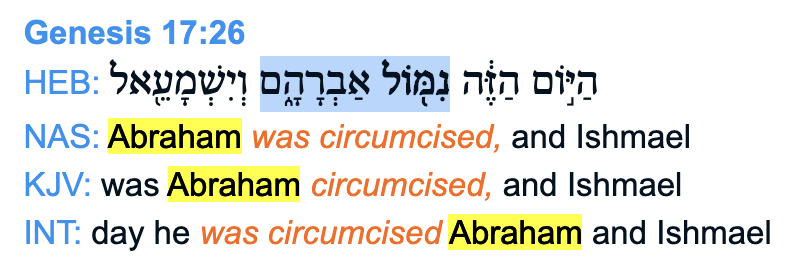 If we look at all the other occurrences of the word מול (mul) in the Bible, we see this word occurs thirty-six times. There are two verses in the entire Bible where this word is preceded after the name Abraham. These two verses are Genesis 17:26 and Genesis 21:4. Below are both verses showing the the Hebrew equivalent of the Arabic مِلَّةَ إِبْرَاهِيمَ (millata ib’rāhīma / the religion of Abraham), which in Old Testament Hebrew occurs as the “circumcision of Abraham”.