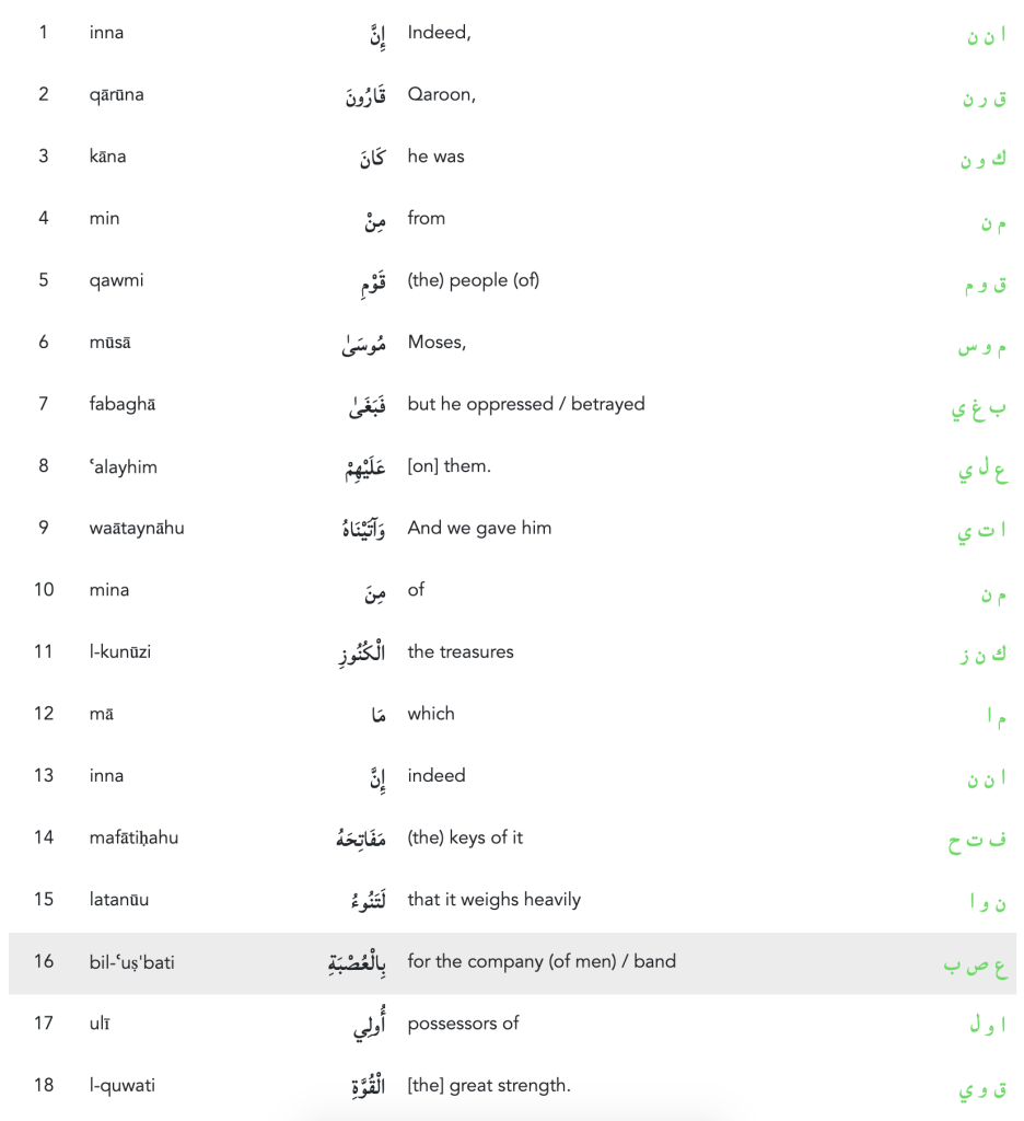 إِنَّ قَارُونَ كَانَ مِنْ قَوْمِ مُوسَىٰ فَبَغَىٰ عَلَيْهِمْ وَآتَيْنَاهُ مِنَ الْكُنُوزِ مَا إِنَّ مَفَاتِحَهُ لَتَنُوءُ بِالْعُصْبَةِ أُولِي الْقُوَّةِ إِذْ قَالَ لَهُ قَوْمُهُ لَا تَفْرَحْ إِنَّ اللَّهَ لَا يُحِبُّ الْفَرِحِينَ