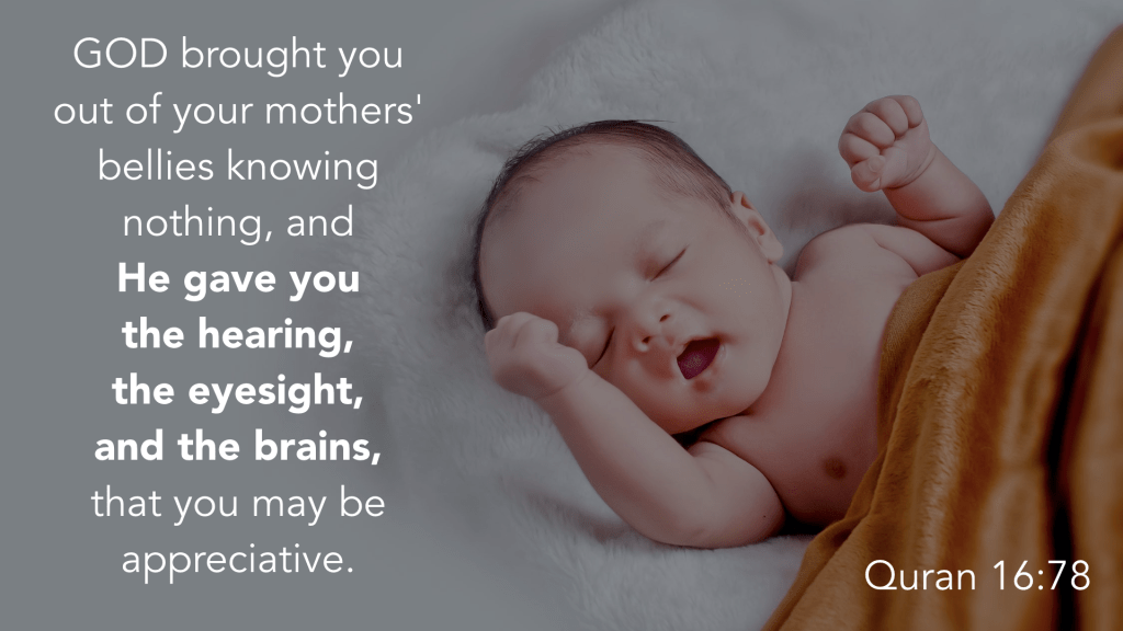 [16:78] GOD brought you out of your mothers’ bellies knowing nothing, and He gave you the hearing, the eyesight, and the brains, that you may be appreciative.