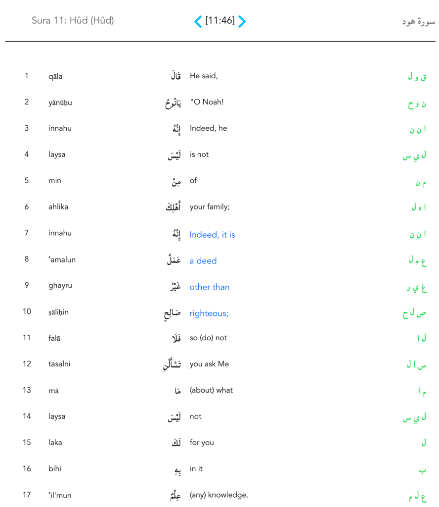 The way the translators above according 11:46 believe that God reprimanded Noah because his son was not righteous, but let’s look at the Arabic to see if this is correct.