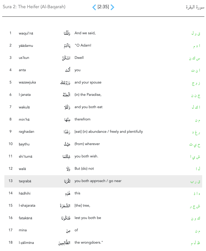 وَقُلْنَا يَاآدَمُ اسْكُنْ أَنْتَ وَزَوْجُكَ الْجَنَّةَ وَكُلَا مِنْهَا رَغَدًا حَيْثُ شِئْتُمَا وَلَا تَقْرَبَا هَٰذِهِ الشَّجَرَةَ فَتَكُونَا مِنَ الظَّالِمِينَ
