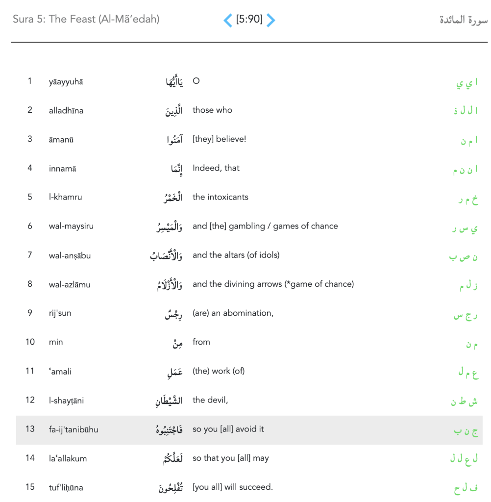 يَاأَيُّهَا الَّذِينَ آمَنُوا إِنَّمَا الْخَمْرُ وَالْمَيْسِرُ وَالْأَنْصَابُ وَالْأَزْلَامُ رِجْسٌ مِنْ عَمَلِ الشَّيْطَانِ فَاجْتَنِبُوهُ لَعَلَّكُمْ تُفْلِحُونَ