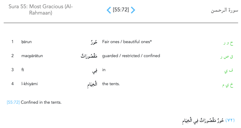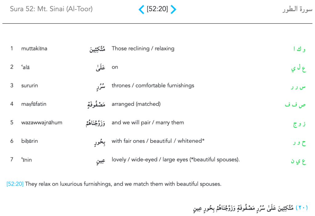 The word حُورٍ in the context of Paradise, occurs in the following verses: 44:54, 52:20, 55:72, and 56:22. Let’s take a look at each of these occurrences in context, which happen to all be in Paradise.