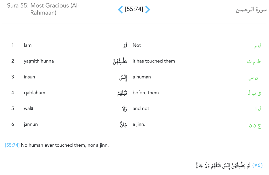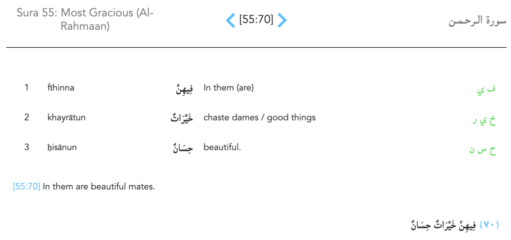 These verses inform us that the spouses the righteous will have in Paradise will be beautiful and chaste. All three verses reaffirm these allegorical spouses purity, beauty, and commitment.