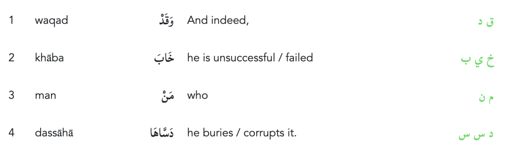 But the person who neglects their soul will never have their soul grow, get purified, and ultimately redeemed. Verse 9:10 uses the term دَسَّاهَا. This root only occurs twice in the entire Quran. The word comes from the root د س س and has the following derivative meanings: to hide, bury, conceal, corrupt. The only other time int he Quran this root is used is in the following verse 16:59: