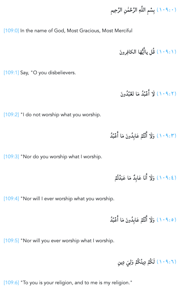 Even in the case of disbelief, God in the Quran advocates tolerance. We read in the Sura 109 entitled The Disbelievers (Al-Kaaferoon) what we are to say to individuals who disbelieve.