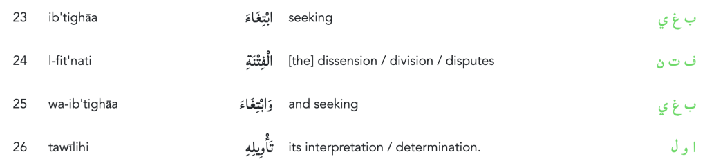 هُوَ الَّذِي أَنْزَلَ عَلَيْكَ الْكِتَابَ مِنْهُ آيَاتٌ مُحْكَمَاتٌ هُنَّ أُمُّ الْكِتَابِ وَأُخَرُ مُتَشَابِهَاتٌ فَأَمَّا الَّذِينَ فِي قُلُوبِهِمْ زَيْغٌ فَيَتَّبِعُونَ مَا تَشَابَهَ مِنْهُ ابْتِغَاءَ الْفِتْنَةِ وَابْتِغَاءَ تَأْوِيلِهِ وَمَا يَعْلَمُ تَأْوِيلَهُ إِلَّا اللَّهُ وَالرَّاسِخُونَ فِي الْعِلْمِ يَقُولُونَ آمَنَّا بِهِ كُلٌّ مِنْ عِنْدِ رَبِّنَا وَمَا يَذَّكَّرُ إِلَّا أُولُو الْأَلْبَابِ
