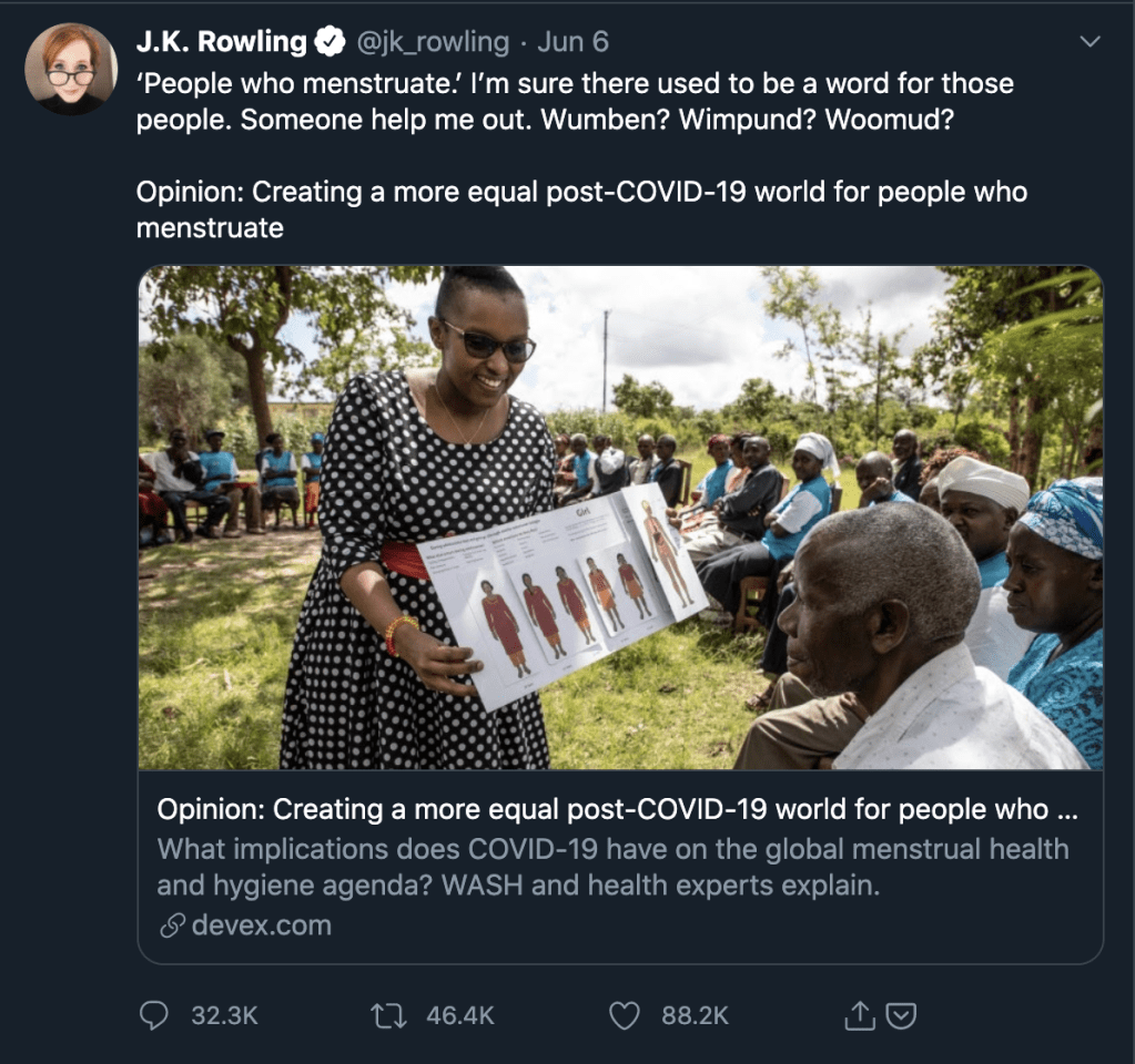 Recently J.K Rowling, author of Harry Potter, is being threatened and pushed to be canceled for her tweet defending that only women can give birth or menstruate.