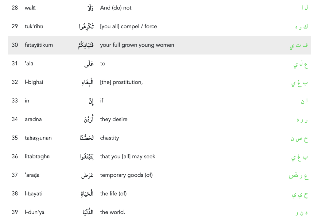 These adopted parents sold an orphan into prostitution in order to repay a debt, but it is even worse than that. The verse above uses the term فَتَيَاتِكُمْ / fatayātikum which specifically means a full grown young women as opposed to a child.