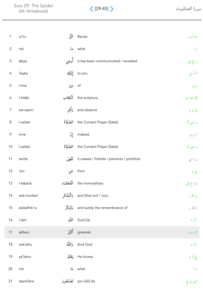 [29:45] You shall recite what is revealed to you of the scripture, and observe the Contact Prayers (Salat), for the Contact Prayers prohibit evil and vice. But the remembrance of GOD (through Salat) is the most important objective (*greatest). GOD knows everything you do.