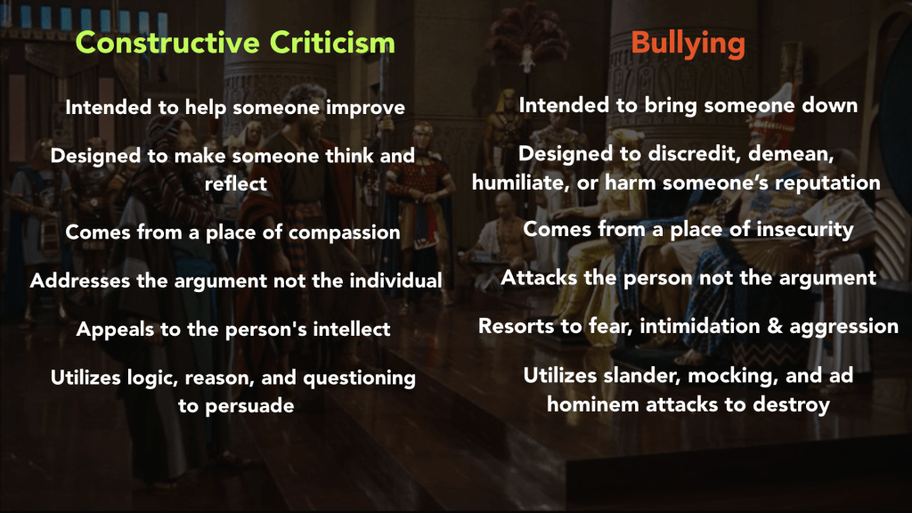 That said, how do we differentiate between reminding as a form of constructive criticism versus reminding as a form of bullying? To contrast these two we can pull from the exchange between Moses and Pharaoh. In this dialogue we see that Moses used constructive criticism to attempt to sway Pharaoh to believe, while Pharaoh used bullying tactics as a rebuttal to Moses. Let’s compare these two methods and identify the differences.