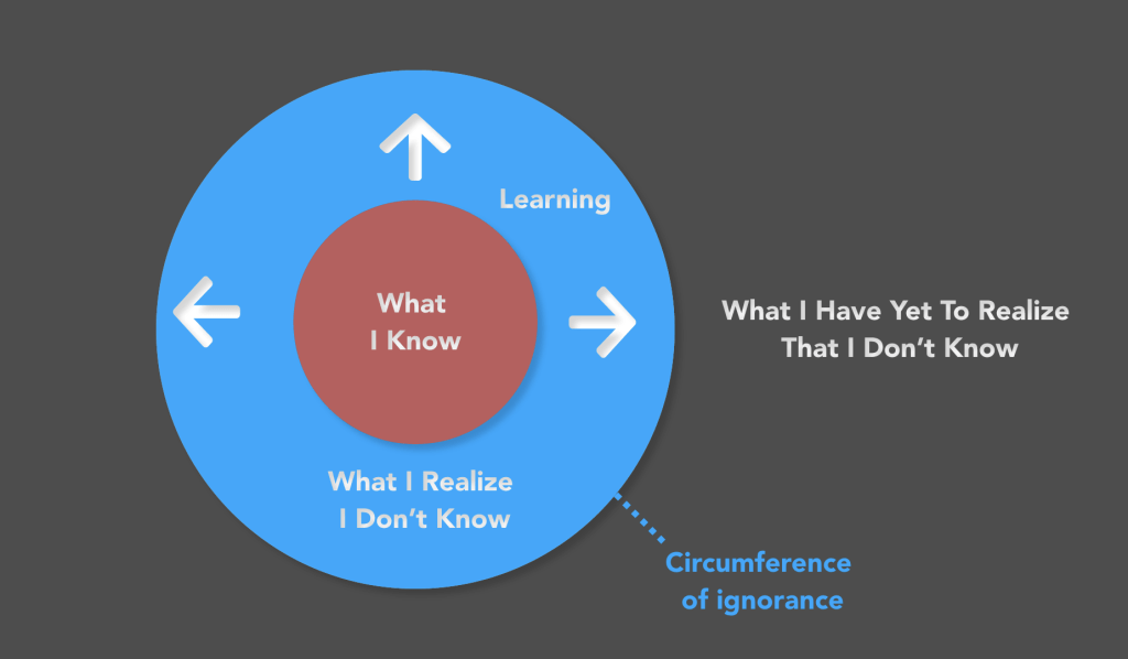 The reason for this paradox is that the more a person learns the more they understand how little they know. Imagine a circle that encompasses the total sum of how much a person knows, and the circumference being the awareness of how much they don’t know. As their circle of knowledge increases through learning, so does their circumference of ignorance.