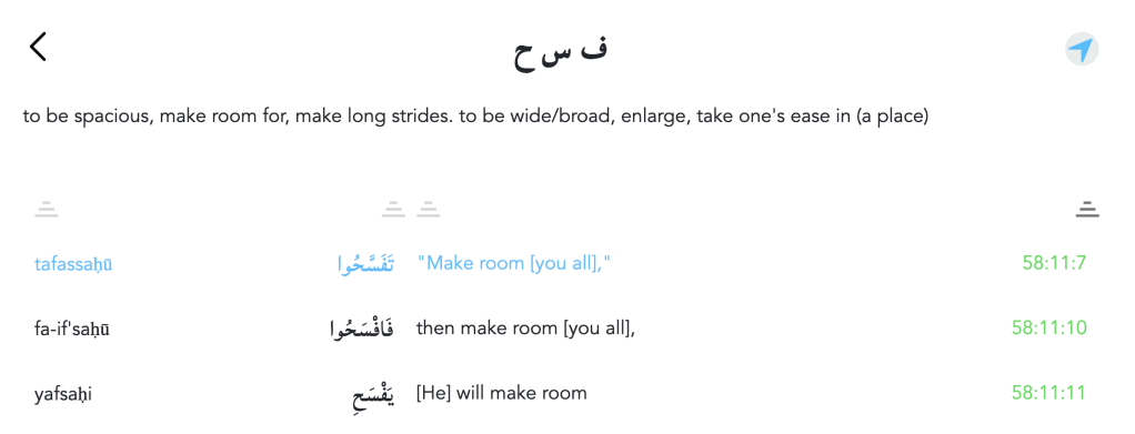 This interpretation is taken from verse 11 of Sura 58, entitled The Debate (Al-Mujaadalah). In this verse we see how God commands us to behave with one another in a congregation, that if someone needs space we should give them their space. Notice that this verse also addresses that “GOD raises those among you who believe, and those who acquire knowledge to higher ranks” which is something we should all aim to do.