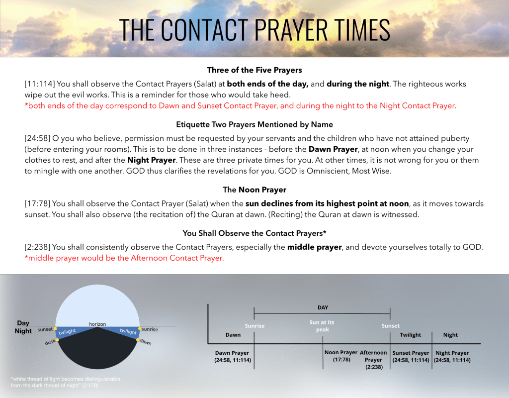 All the practices of Submission (Islam) originated from Abraham. This includes the five daily Contact Prayers (Salat). A careful analysis of the Quran confirms the five Contact Prayer (Salat) times based on the following verses: