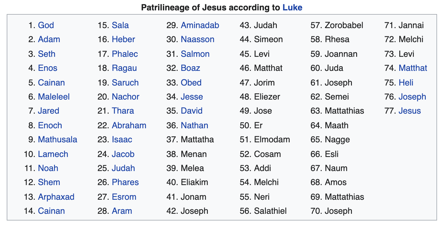 Another example can be found in the genealogy of Jesus. The New Testament provides two accounts of the genealogy of Jesus, one in the Gospel of Matthew and another in the Gospel of Luke. Matthew starts with Abraham, while Luke begins with Adam. The lists are identical between Abraham and David, but differ radically from that point. Matthew has twenty-seven generations from David to Joseph, whereas Luke has forty-two, with almost no overlap between the names on the two lists. Notably, the two accounts also disagree on who Joseph’s father was: Matthew says he was Jacob, while Luke says he was Heli.