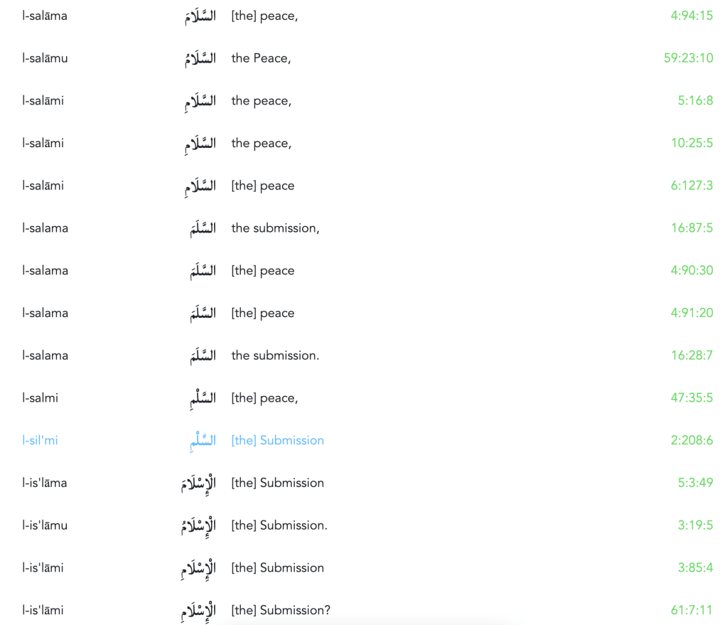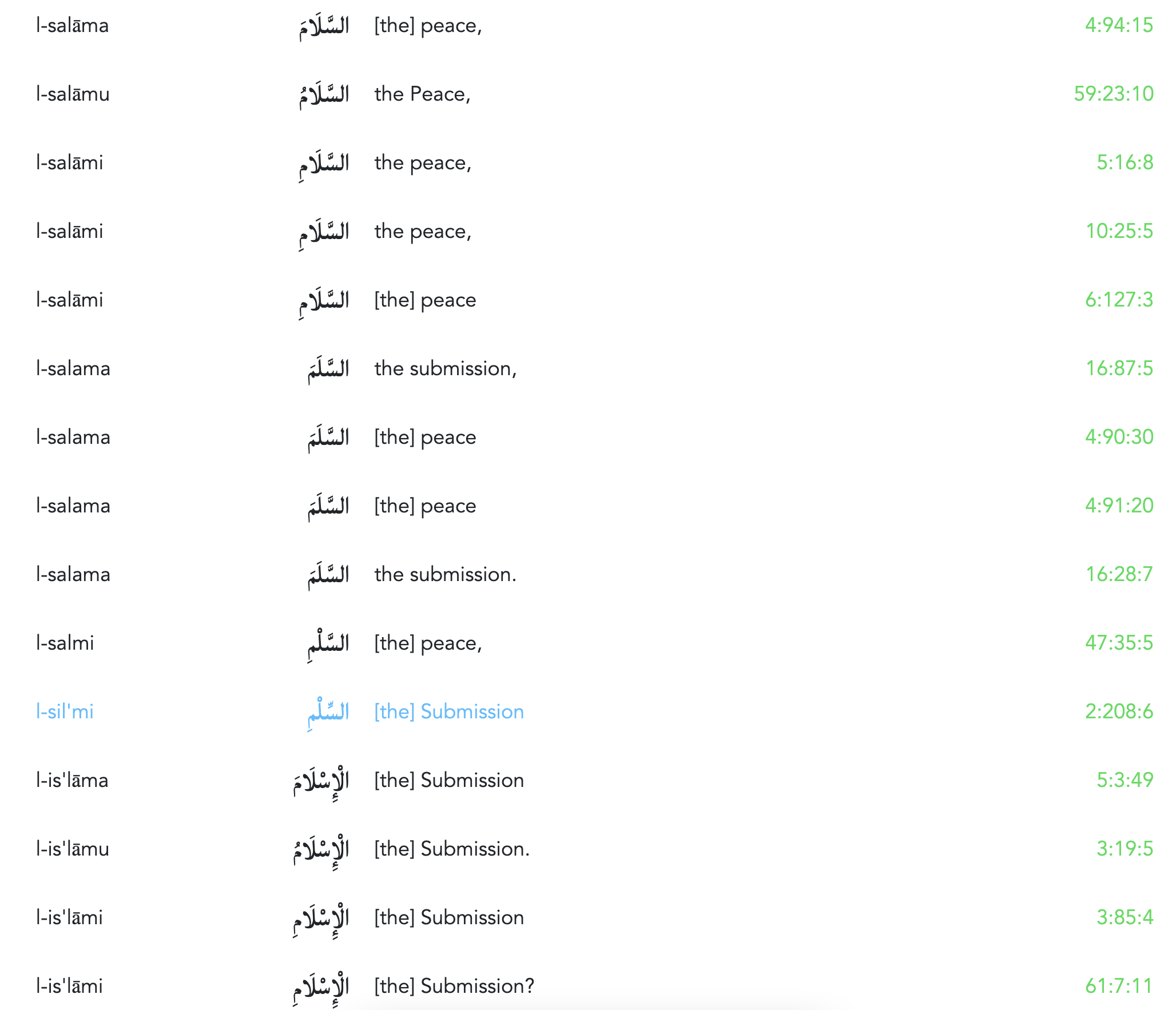 Another example in how the root words can shed light on the understanding of a word that is oftentimes lost in translation are the terms Muslim and Islam which all come from the same root. While a translation may translate this word as Submission (Islam) and Submitter (Muslim) to better represent the meaning of this word, when studying the Arabic we see that this is the same root as used for the word Salam as in Peace. Thus a Muslim following the religion of Islam can also be understood as not only a Submitter who Submits, but also as a Peace-Maker following the religion of Peace.
