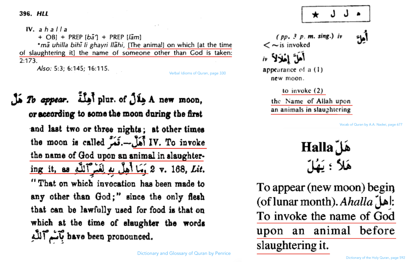 Despite variations in the English translation the Arabic of the four verses is roughly the same regarding the fourth dietary prohibition, and it is easily resolved by understanding the mean of the word أُهِلَّ (uhila). This word comes from the root ahila which means “to invoke the name of God upon an animal before slaughtering it.”
