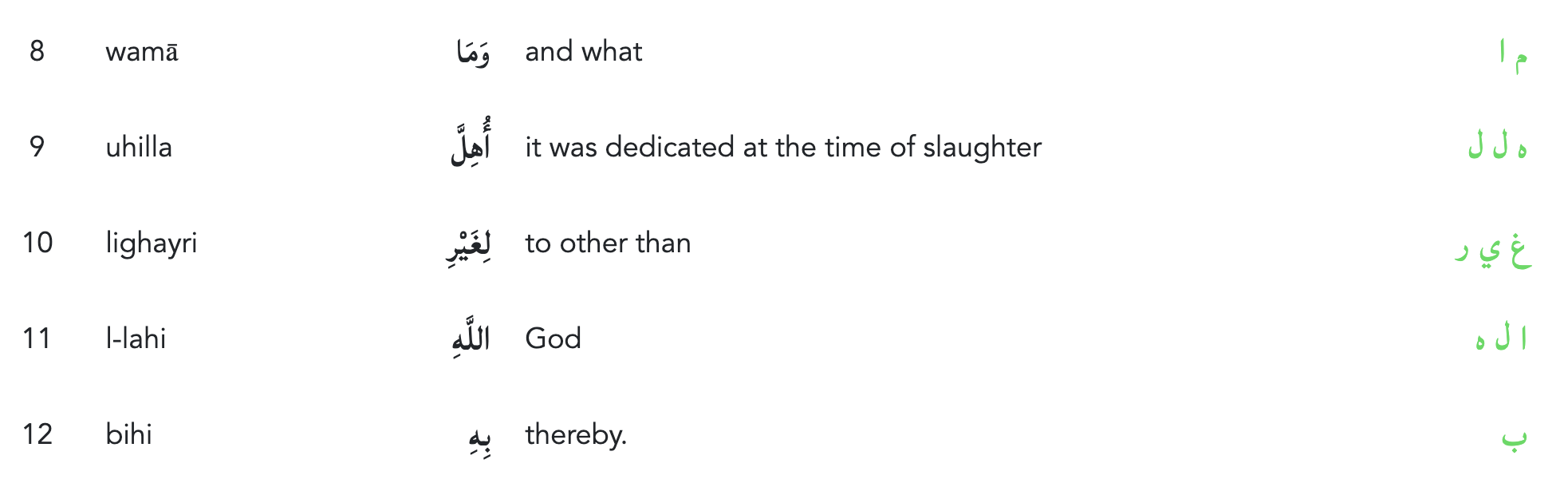Another example of how the translation may be ambiguous while the Arabic leaves no doubt is regarding the dietary prohibitions. Four times in the Quran the dietary prohibition are spelled out for readers of the Quran (2:173, 5:3, 6:145, 16:115). When reading the translation sometimes the fourth dietary prohibition can be hard to understand if it includes animals which the name of God was not mentioned upon them at the time of slaughter, and if the prohibition includes all foods or just animal products. This ambiguity is resolved in the Arabic Quran.