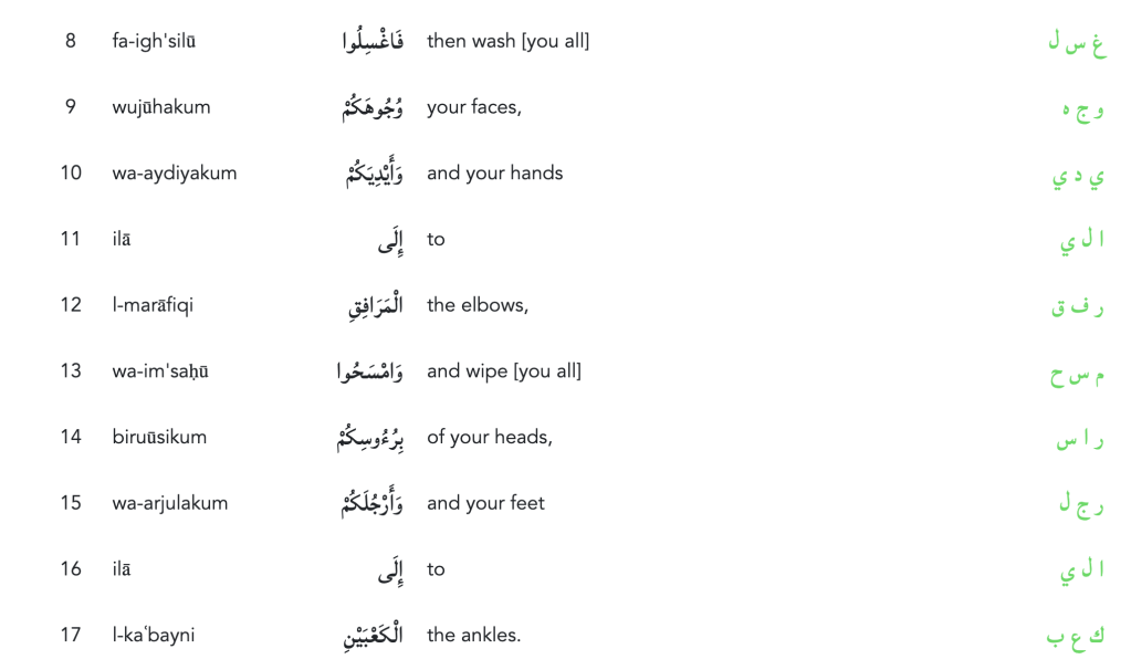 يَاأَيُّهَا الَّذِينَ آمَنُوا إِذَا قُمْتُمْ إِلَى الصَّلَاةِ فَاغْسِلُوا وُجُوهَكُمْ وَأَيْدِيَكُمْ إِلَى الْمَرَافِقِ وَامْسَحُوا بِرُءُوسِكُمْ وَأَرْجُلَكُمْ إِلَى الْكَعْبَيْنِ وَإِنْ كُنْتُمْ جُنُبًا فَاطَّهَّرُوا وَإِنْ كُنْتُمْ مَرْضَىٰ أَوْ عَلَىٰ سَفَرٍ أَوْ جَاءَ أَحَدٌ مِنْكُمْ مِنَ الْغَائِطِ أَوْ لَامَسْتُمُ النِّسَاءَ فَلَمْ تَجِدُوا مَاءً فَتَيَمَّمُوا صَعِيدًا طَيِّبًا فَامْسَحُوا بِوُجُوهِكُمْ وَأَيْدِيكُمْ مِنْهُ مَا يُرِيدُ اللَّهُ لِيَجْعَلَ عَلَيْكُمْ مِنْ حَرَجٍ وَلَٰكِنْ يُرِيدُ لِيُطَهِّرَكُمْ وَلِيُتِمَّ نِعْمَتَهُ عَلَيْكُمْ لَعَلَّكُمْ تَشْكُرُونَ