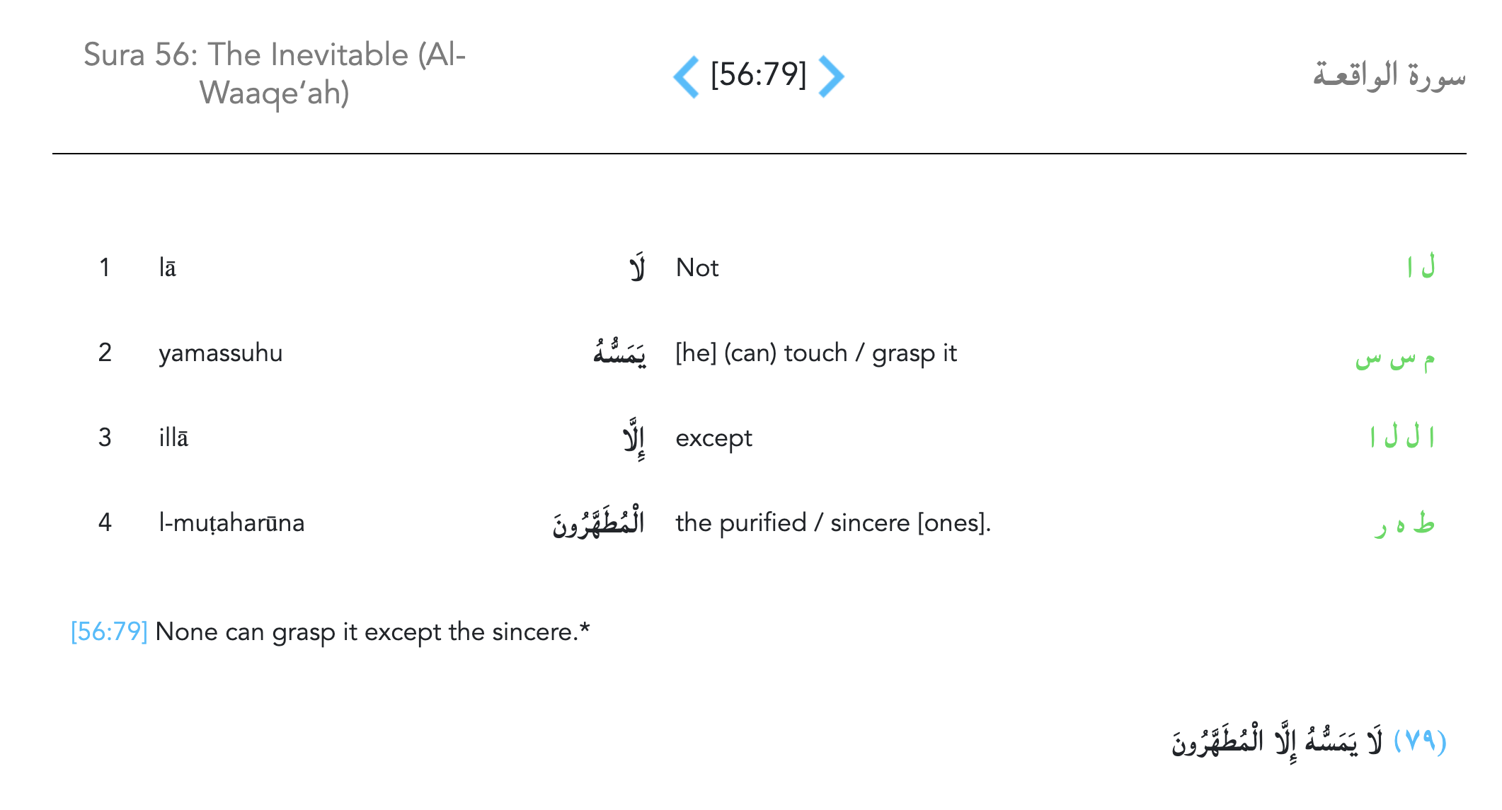 This distinction may be confusing for some causing many to think that one has to be physically clean in order to touch or read the Quran, to the extent that many cultures prohibit menstruating women from touching a Quran. But in Arabic this ambiguity is clear. For one notice that it uses the masculine form for the word touch يَمَسُّهُ / yamassuhu. Individuals have twisted the meaning of this verse to prohibit half the Muslim world from being able to study the Quran and perform these sacred duties for a big chunk of their adult lives. Funny how the verse that states who can access the Quran is misunderstood by so many people.