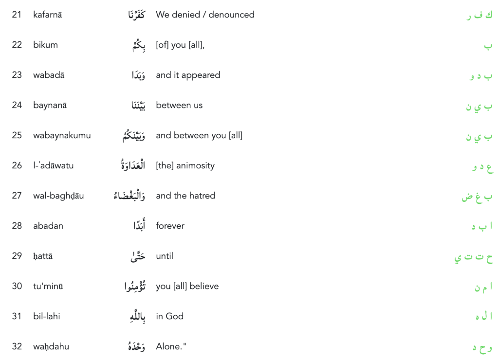In addition to roots sometimes elements of context are missing in a translation that are apparent in the original Arabic. In the following verse of Sura 60 verse 4, Abraham is informing his people that he is against them, but one key piece that is not fully encompassed in the translation is that the animosity and hatred that is felt is not just from Abraham directed towards his people, but mutual between him and his people.