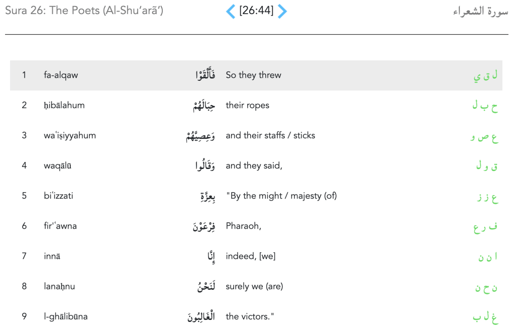 فَأَلْقَوْا حِبَالَهُمْ وَعِصِيَّهُمْ وَقَالُوا بِعِزَّةِ فِرْعَوْنَ إِنَّا لَنَحْنُ الْغَالِبُونَ
