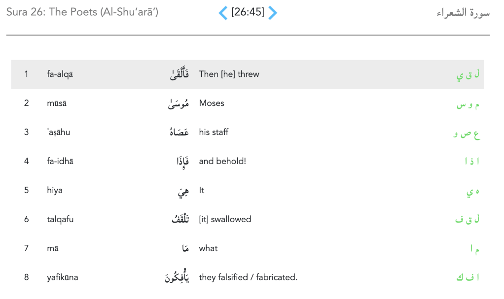 [26:45] Moses threw his staff, whereupon it swallowed what they fabricated.