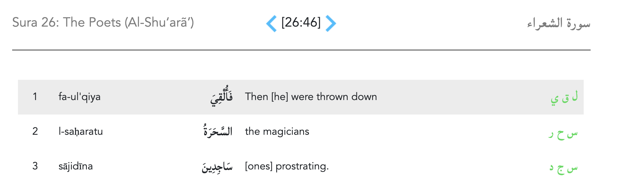 What is interesting is that the Arabic word used in the verses about the magicians falling prostrate is أُلْقِيَ (ul’qiya) as opposed to أَلْقَىٰ (alqaw). This would mean that the magicians were thrown down, as opposed to they fell down prostrating.