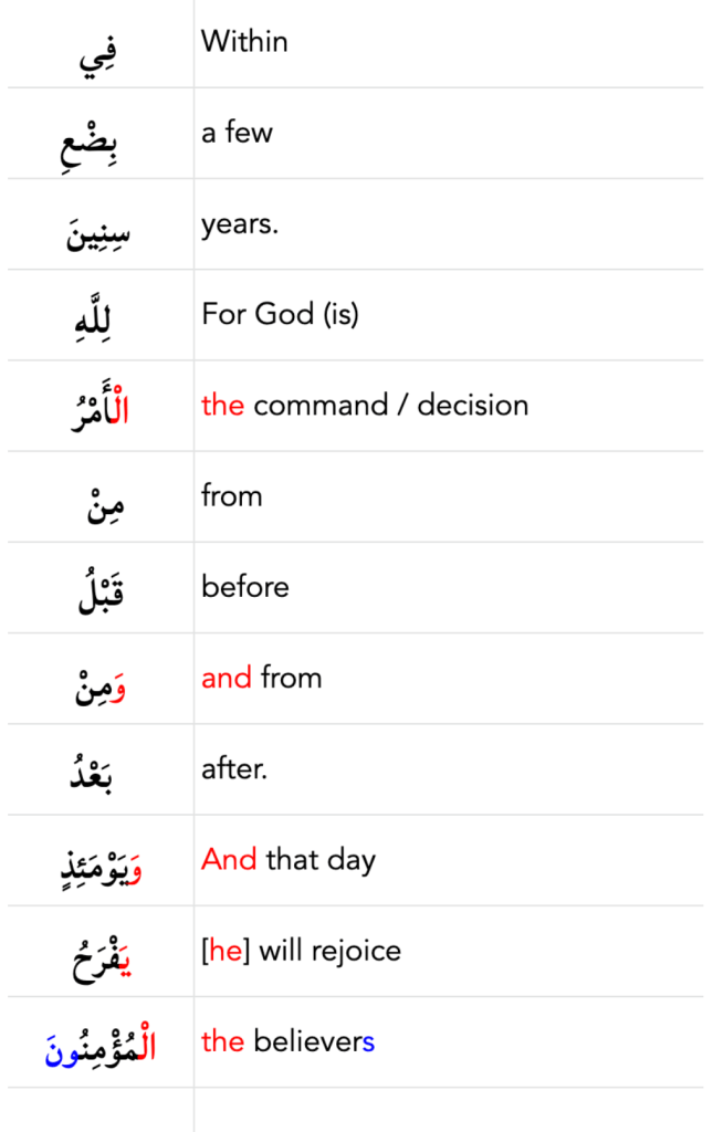 30:2-3 informs us that within a few years from the revelation of this prophecy in the Quran that the Romans will overcome from their defeat. When the Arabic word for “few” بِضْعِ biḍ’ʿi is used it is understood to be 3 – 9 years (inclusive). Since the prophecy happened shortly before the year 622 for this prophecy to be true the victory should have happened before the year 631.