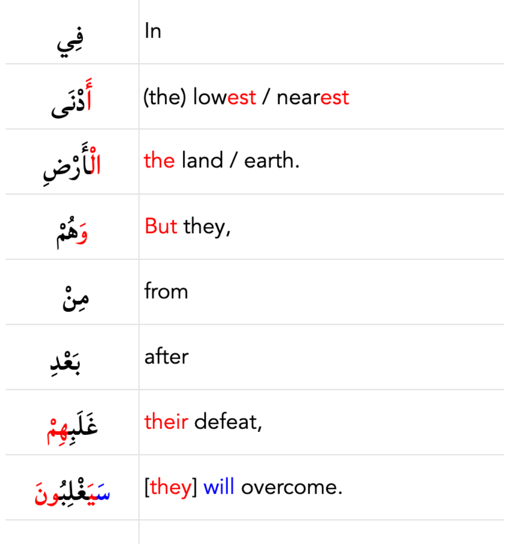 Verse 3 indicates that the defeat will occur in أَدْنَى الْأَرْضِ. The word أَدْنَى adnā comes from the root د ن و and has the derivative meanings of near, low, or few. By adding the أَ at the beginning of the word this would make the translation as the nearest, lowest, or fewest.