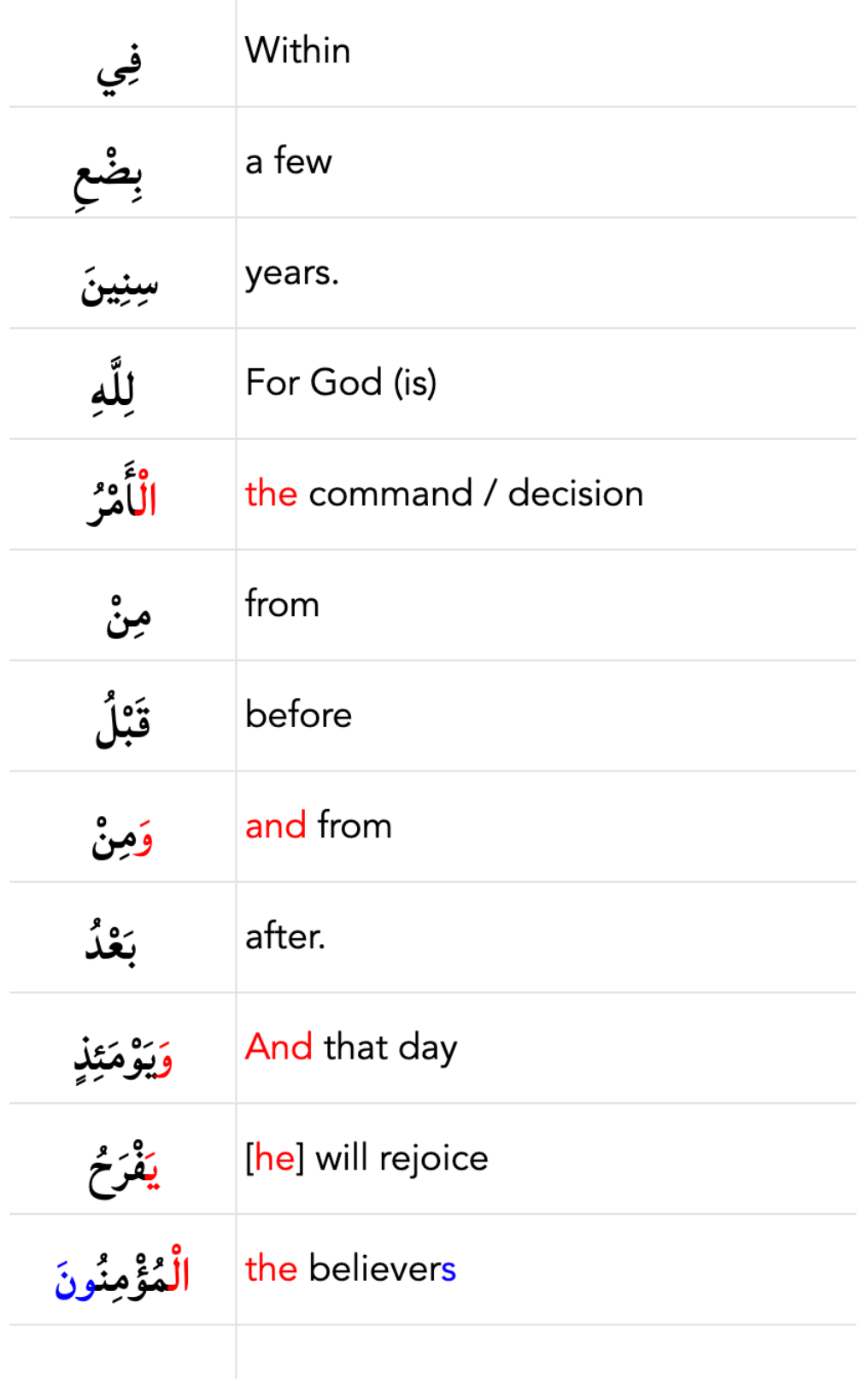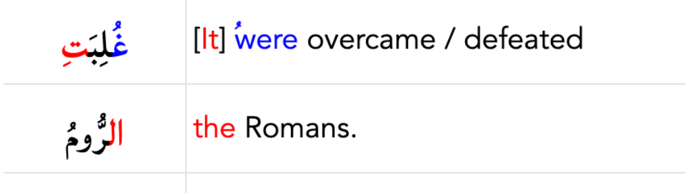 Notice that this verse is written in the past tense using the Arabic ghulibati / غُلِبَتِ as opposed to tagliba / تغلب. And since it has the ḍammah above the غ this informs the reader that the defeating was happening to the Romans and not that the Romans were the ones doing the defeating. So from this verse we can concur that the Roman defeat has already occurred at the time of this revelation.