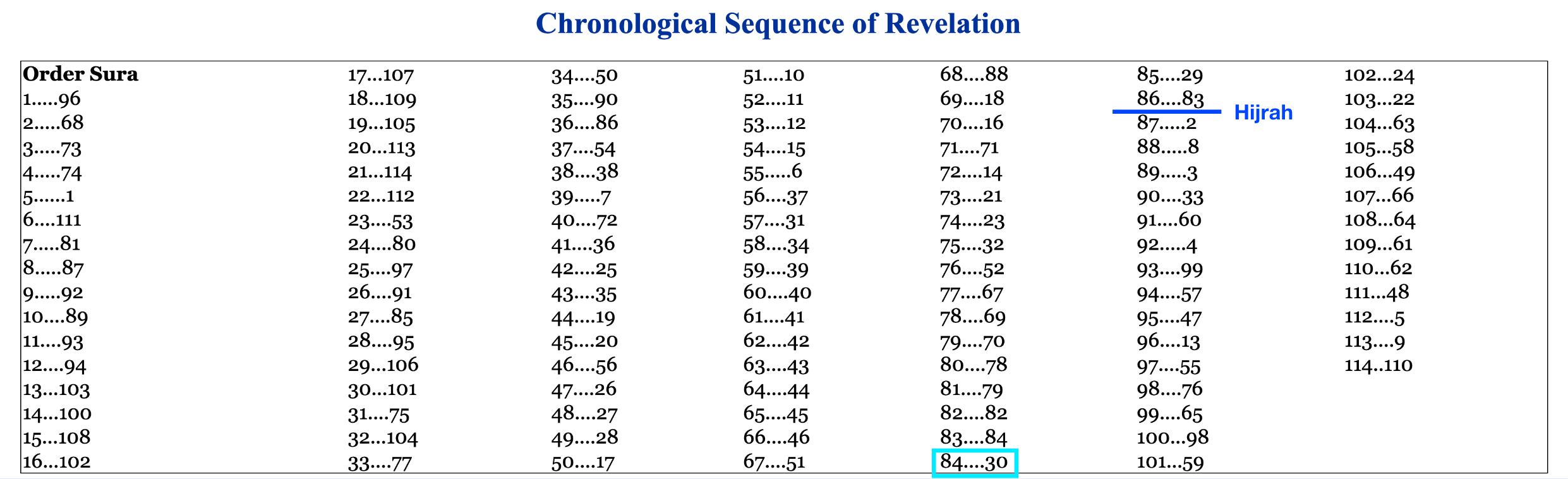 Sura 30 of the Quran is entitled Romans (Al-Room). It is believed to be revealed in Mecca as the 84th revelation of the Quran. This will place this revelation just shortly before the Hijrah in 622 when Muhammad and the believers emigrated from Mecca to Medina marking the start of the Islamic calendar. This is because the first Sura that was revealed in Medina is believed to be Sura 2 which is considered the 87th revelation, so just two revelations after Sura 30.