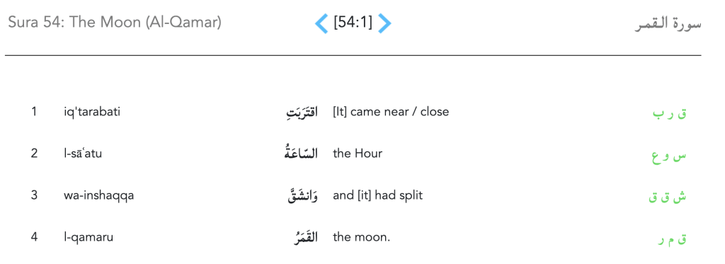 Sura 54 of the Quran is entitled Al-Qamar, The Moon, الـقمـر, and the opening verse of this Sura states: