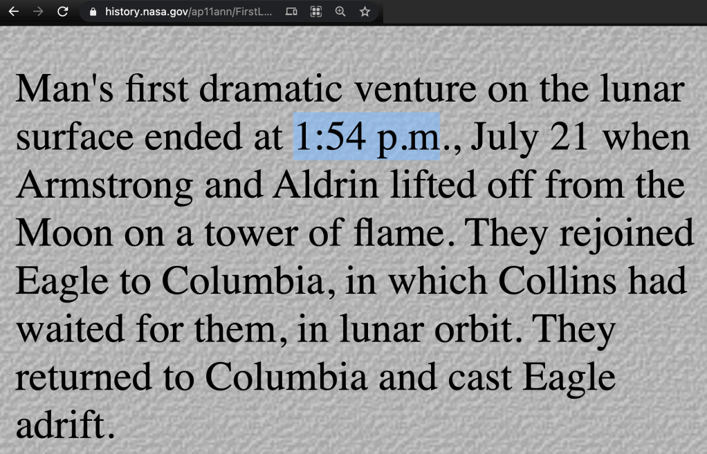 However, some may argue that based on where a person was in the world, the hour of departure would be represented differently. If we go with EDT time as per the Kennedy Space Center located on Merritt Island, Florida, which was mission control for Apollo 11, we see that the time was 1:54p.m.