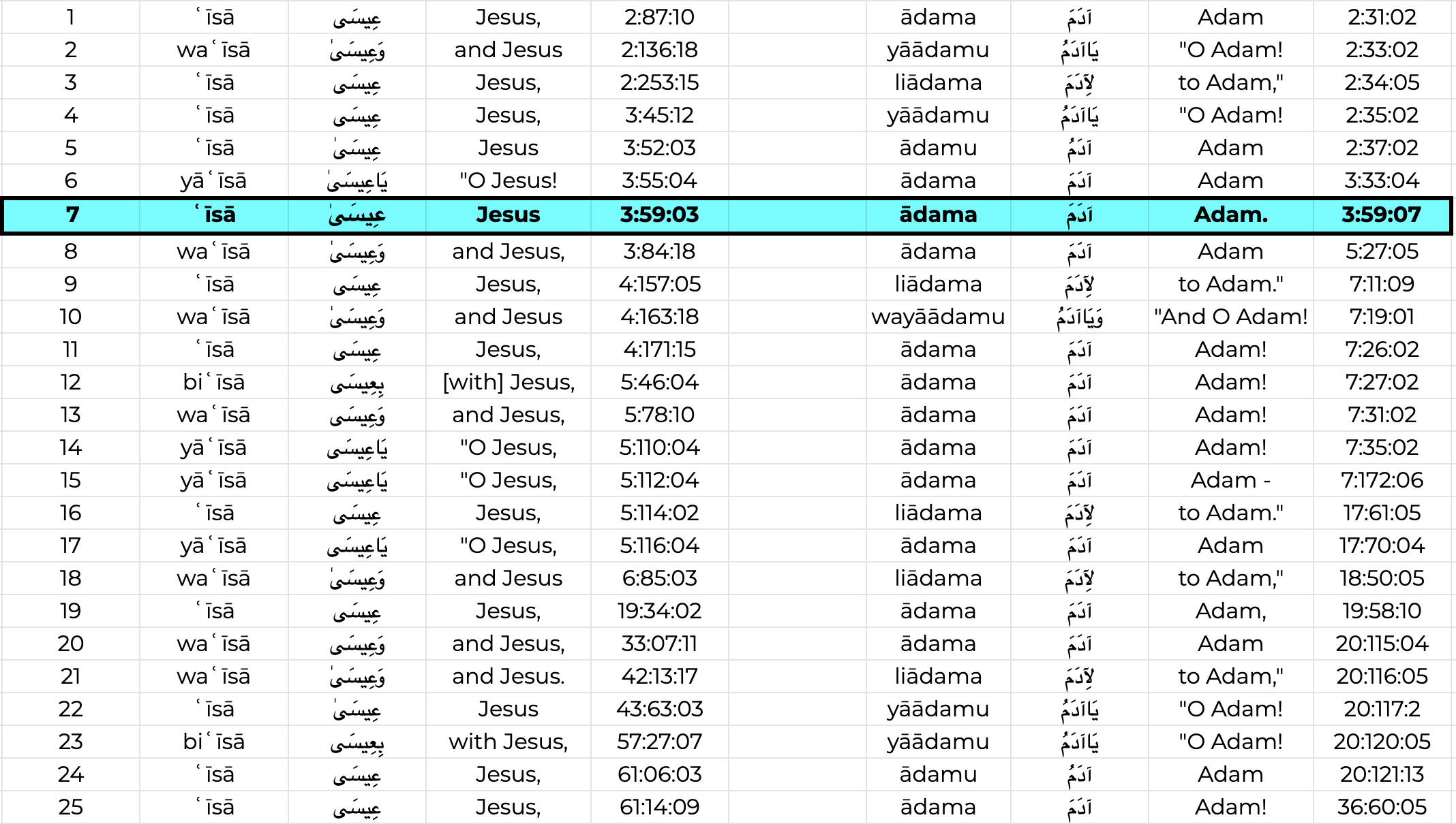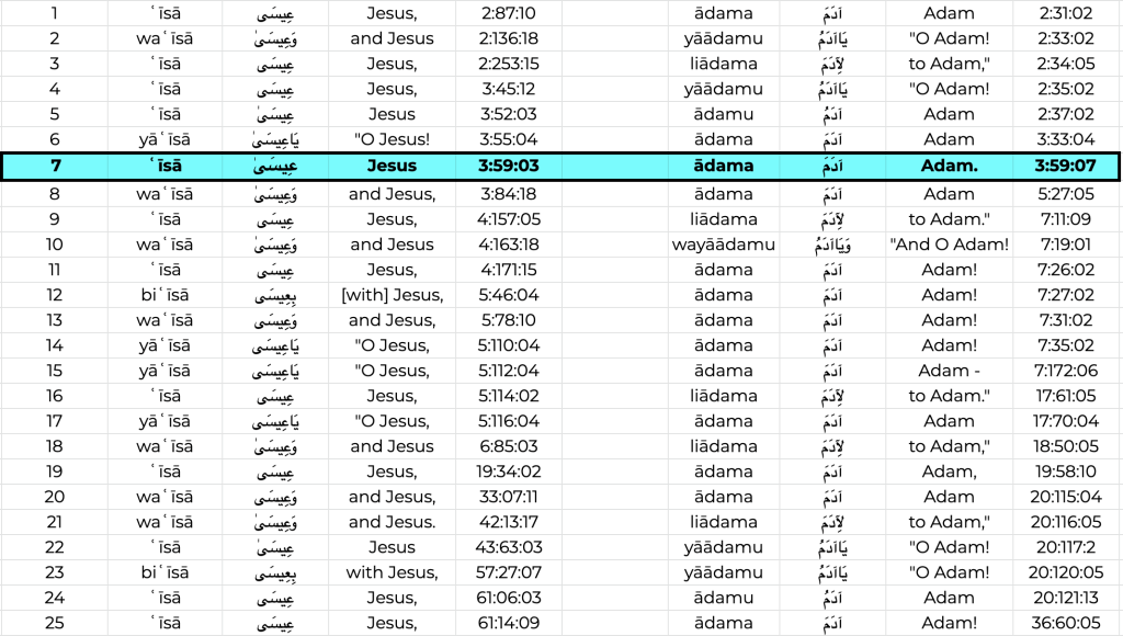 We see that verse 3:59 is the 7th occurrence of each of their names in the Quran.