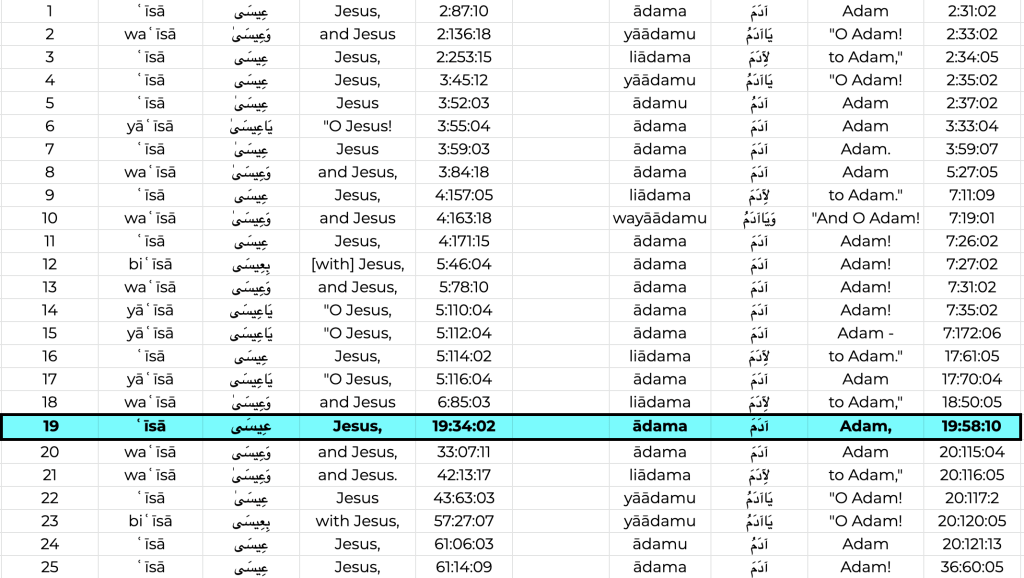 We see that the 19th occurrence of Jesus occurs in 19:34, while the 19th occurrence of Adam occurs in 19:58, which are 25 verses apart.