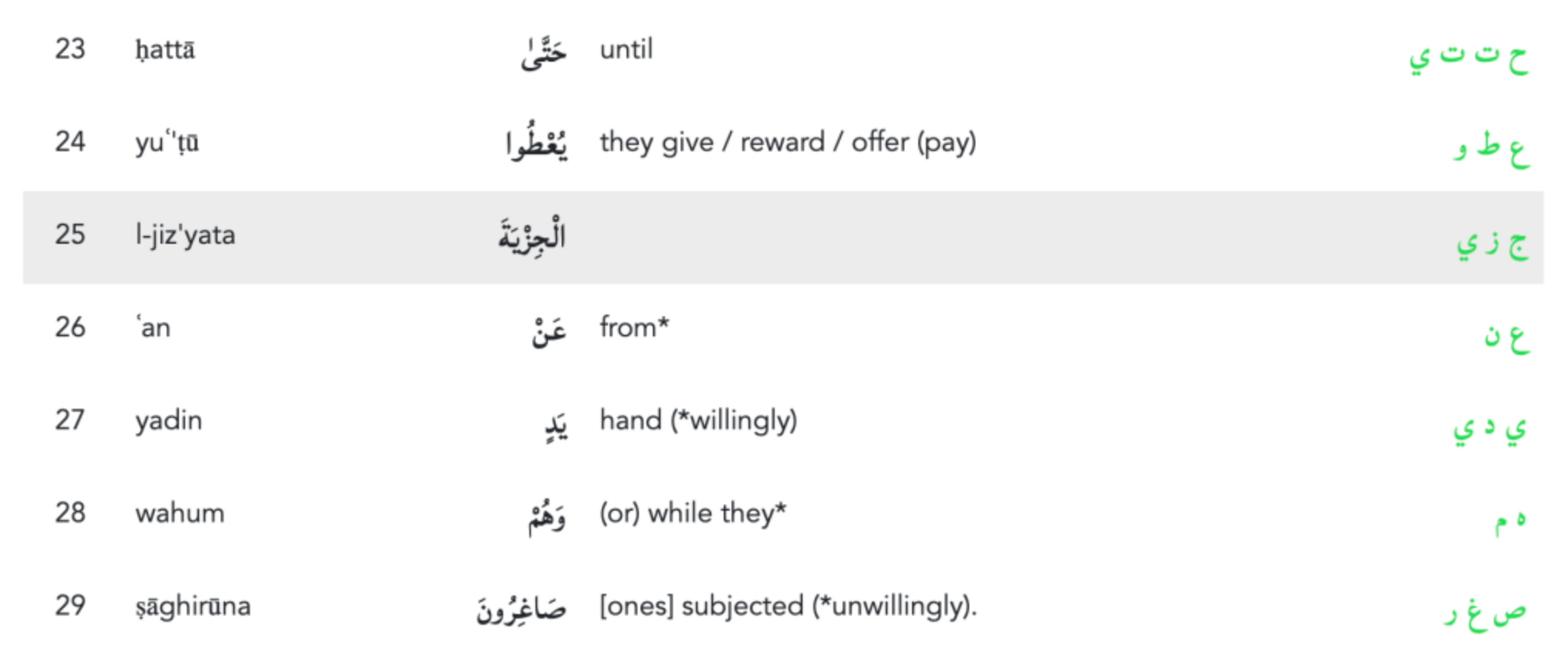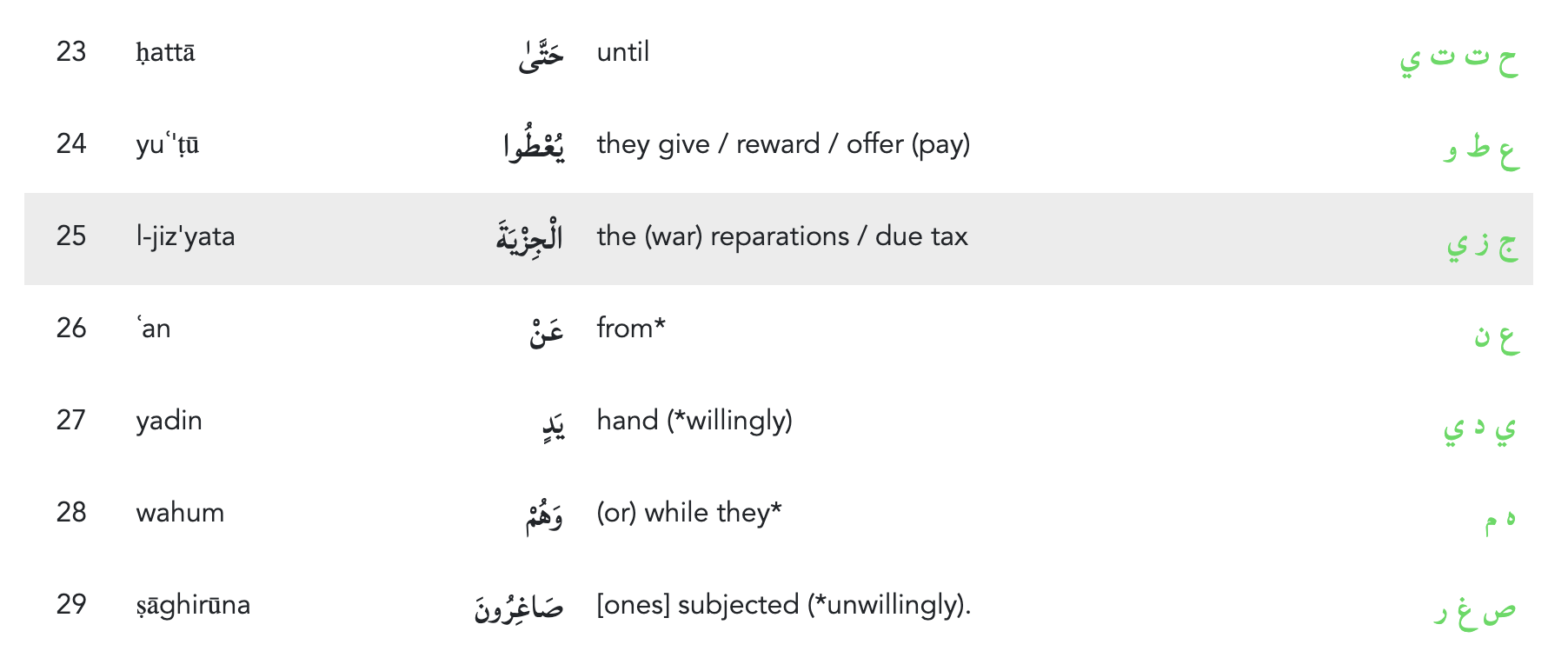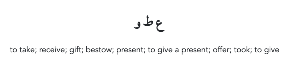 The other word of interest from 9:29 is the Arabic word yuʿ’ṭū / يُعْطُوا which can be translated as “they give / reward / offer”. The root for this word occurs in the 14 times and is typically associated with the context of offering or gifting something.