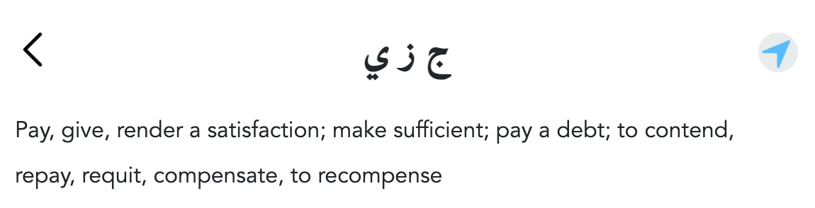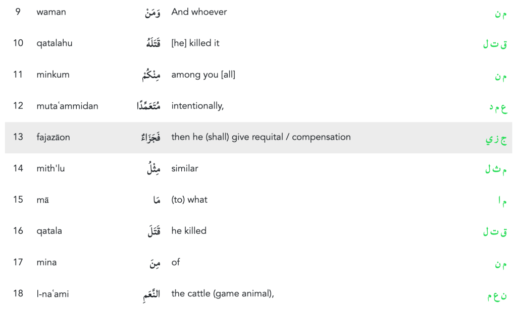 Throughout the Quran the root is used in the context of paying back what is owed in the form of a recompense, requital, reward, or compensation. For instance, in the below verse we see that a jizya is required for people who kill game during pilgrimage equivalent to the game animals they killed.