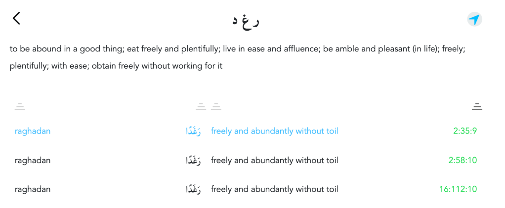The word ragadan only occurs three times in the Quran, the second occurrence is used in regards to the Children of Israel towards their command to enter the Promised Land. It reads.