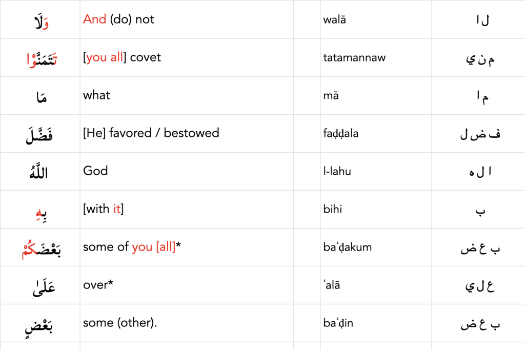 وَلَا تَتَمَنَّوْا مَا فَضَّلَ ٱللَّهُ بِهِۦ بَعْضَكُمْ عَلَىٰ بَعْضٍ لِّلرِّجَالِ نَصِيبٌ مِّمَّا ٱكْتَسَبُوا وَلِلنِّسَآءِ نَصِيبٌ مِّمَّا ٱكْتَسَبْنَ وَسْـَٔلُوا ٱللَّهَ مِن فَضْلِهِۦٓ إِنَّ ٱللَّهَ كَانَ بِكُلِّ شَىْءٍ عَلِيمًا
