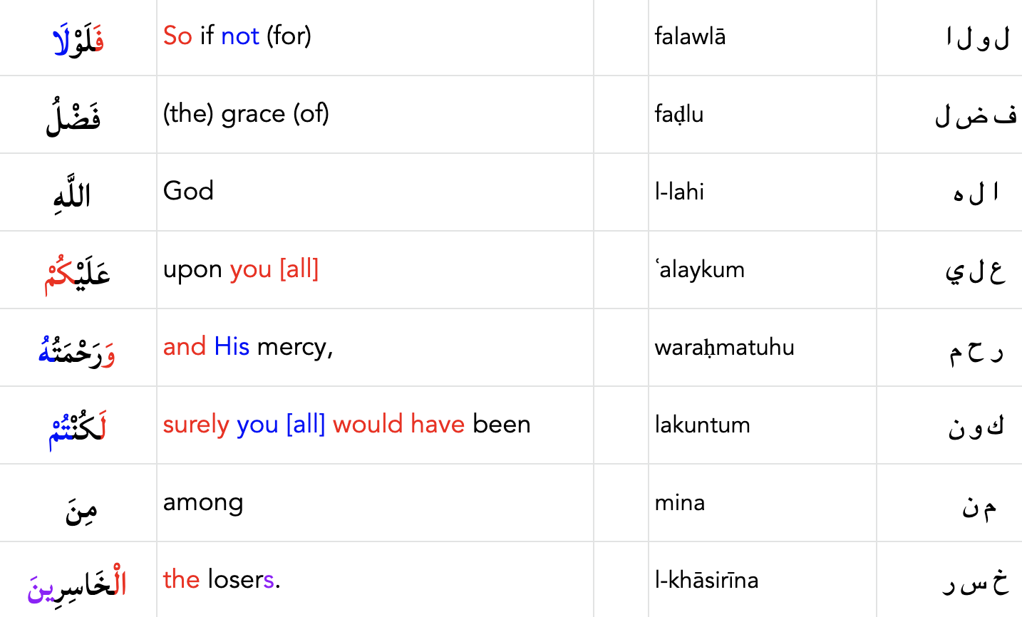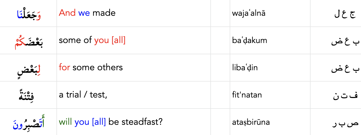 Another example is with the preposition of ل as in the expression بَعْضَكُمْ لِبَعْضٍ (baʿḍukum lebaʿḍin). The ل with a kasra, the diagonal stroke written below the consonant, when added to the prefix of a word signifies that this is a preposition “to, for, by”. So this expression would signify one group to another group and would be best translated as “you by each other.”