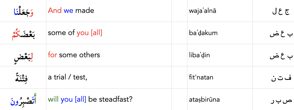 وَمَآ أَرْسَلْنَا قَبْلَكَ مِنَ ٱلْمُرْسَلِينَ إِلَّآ إِنَّهُمْ لَيَأْكُلُونَ ٱلطَّعَامَ وَيَمْشُونَ فِى ٱلْأَسْوَاقِ وَجَعَلْنَا بَعْضَكُمْ لِبَعْضٍ فِتْنَةً أَتَصْبِرُونَ وَكَانَ رَبُّكَ بَصِيرًا
