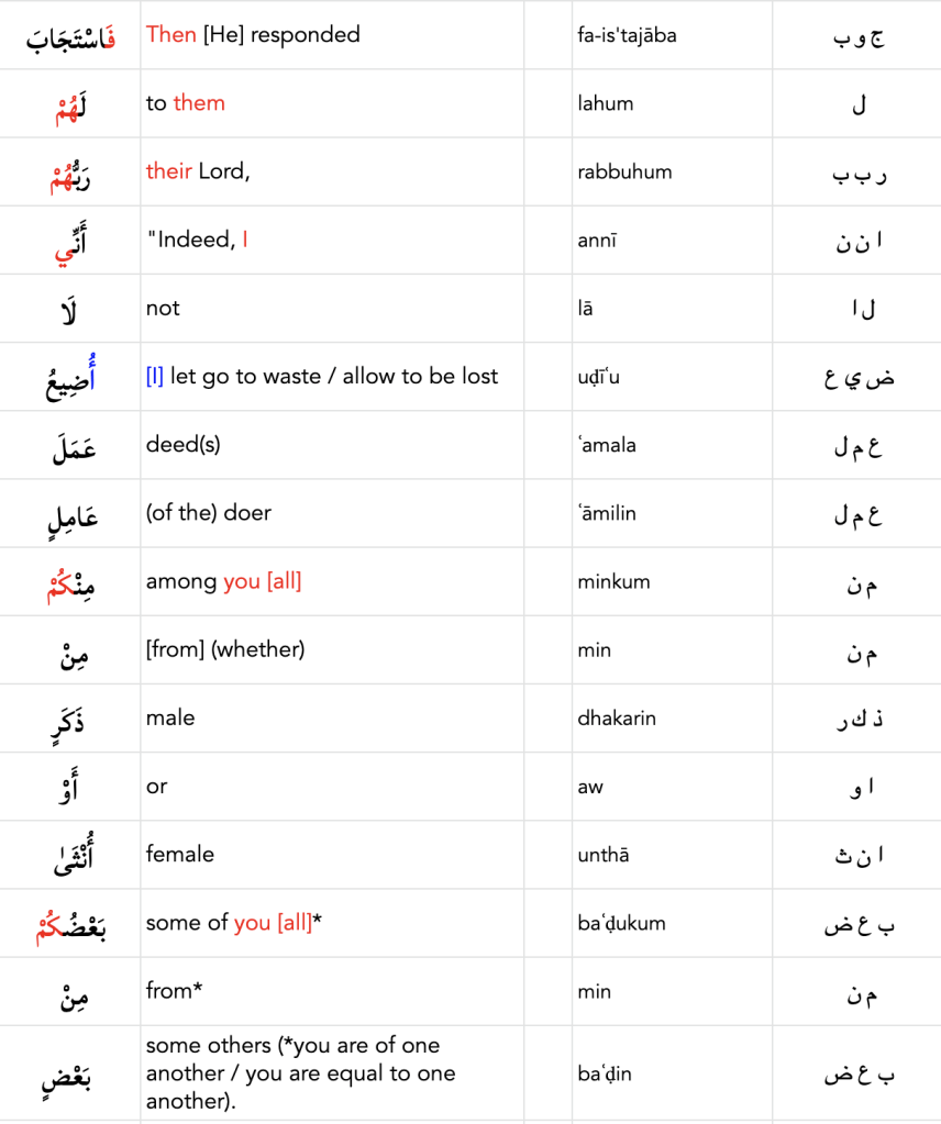 فَاسْتَجَابَ لَهُمْ رَبُّهُمْ أَنِّي لَا أُضِيعُ عَمَلَ عَامِلٍ مِنْكُمْ مِنْ ذَكَرٍ أَوْ أُنْثَىٰ بَعْضُكُمْ مِنْ بَعْضٍ فَالَّذِينَ هَاجَرُوا وَأُخْرِجُوا مِنْ دِيَارِهِمْ وَأُوذُوا فِي سَبِيلِي وَقَاتَلُوا وَقُتِلُوا لَأُكَفِّرَنَّ عَنْهُمْ سَيِّئَاتِهِمْ وَلَأُدْخِلَنَّهُمْ جَنَّاتٍ تَجْرِي مِنْ تَحْتِهَا الْأَنْهَارُ ثَوَابًا مِنْ عِنْدِ اللَّهِ وَاللَّهُ عِنْدَهُ حُسْنُ الثَّوَابِ