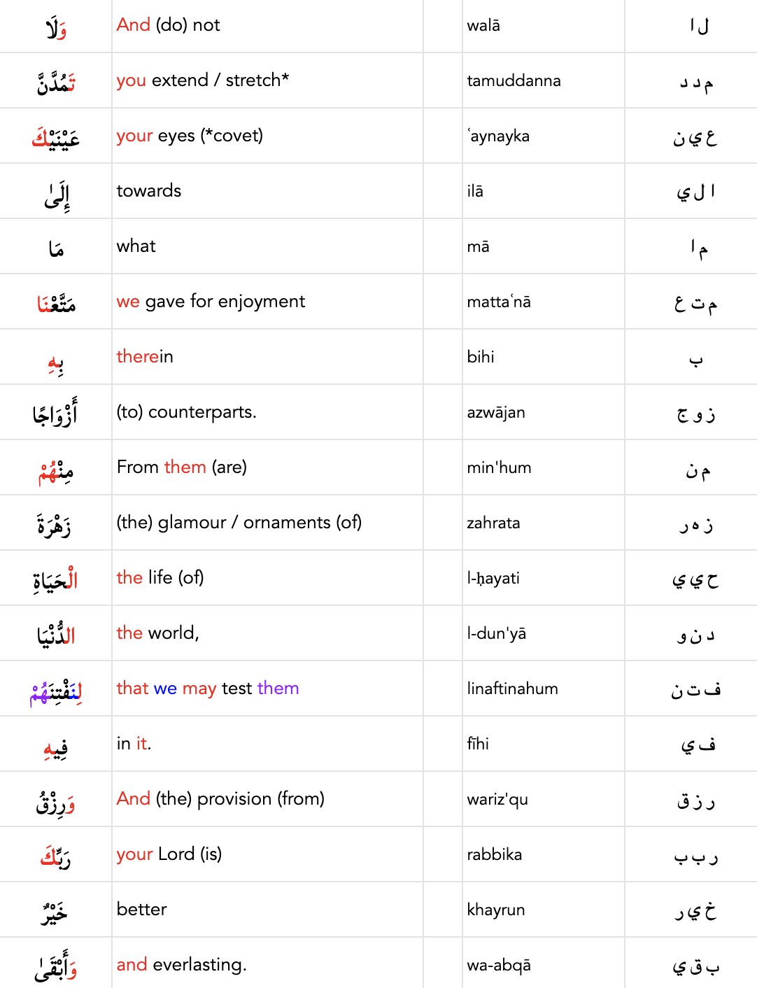 وَلَا تَمُدَّنَّ عَيْنَيْكَ إِلَىٰ مَا مَتَّعْنَا بِهِ أَزْوَاجًا مِنْهُمْ زَهْرَةَ الْحَيَاةِ الدُّنْيَا لِنَفْتِنَهُمْ فِيهِ وَرِزْقُ رَبِّكَ خَيْرٌ وَأَبْقَىٰ