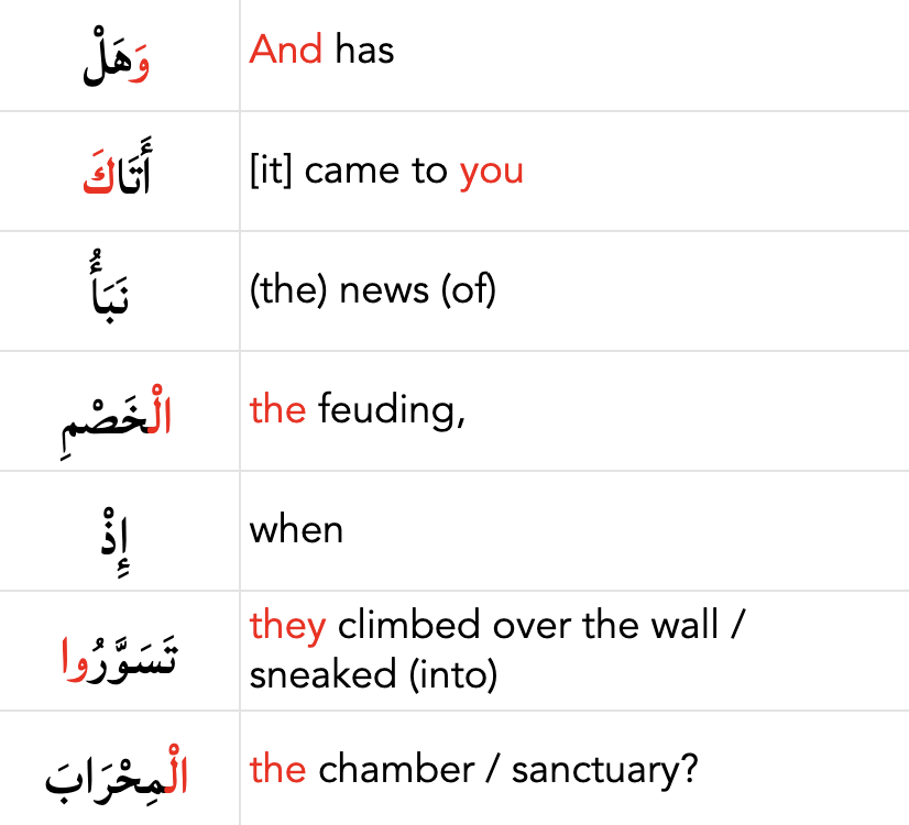 (٢١) وَهَلْ أَتَاكَ نَبَأُ الْخَصْمِ إِذْ تَسَوَّرُوا الْمِحْرَابَ